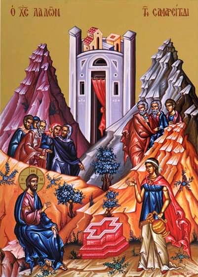 في ذلك الزمان أتى يسوع الى مدينـة من السامرة يقال لها سوخار بقرب الضيعـة التي أعطاها يعقوب ليوسف ابنـه. وكان هناك عين يعقوب. وكان يسوع قد تعـب من المسير، فجلس على العـين وكان نحو الساعة السادسة. فجاءت امرأة من السامرة لتستقي مـاءً. فقال لها يسوع: أَعطينـي لأشـرب -فإن تلاميذه كانوا قد مضوا الى المدينـة ليبتاعـوا طعاما- فقالت لـه المرأة السامريـة: كيف تطلب ان تشـرب مني وأنت يهـوديّ وانا امرأة سامرية، واليهود لا يخالطون السامـريين؟ أجاب يسوع وقال لها: لو عَرفتِ عطية الله ومَن الذي قال لك أعطيني لأشرب لطلبتِ انتِ منه فأعطاكِ ماءً حيـًا. قالت له المرأة: يا سيد إنه ليس معك ما تستقي به والبئر عميـقـة، فمن أين لك الماء الحي؟ ألعلّك أنـت أعظـم مـن أبينا يـعـقــوب الــذي أعـطـانـا الـبــئـر ومـنـها شرب هـو وبـنـوه وماشيتـه؟ أجاب يسـوع وقال لها: كل من يشرب من هذا الماء يعطش أيضا، واما من يشرب من الماء الذي انا أعطيـه فلن يعطش الى الأبد، بل الماء الذي أعطيه له يصير فيه ينبوع ماء ينبع الى حياة أبديـة. فقالت له المـرأة: يا سيد أعطني هذا الماء لكي لا أعطش ولا أجيء الى ههنا لأستقي. فقال لها يسوع: اذهبي وادعي رَجُلَك وهـلمّي الى ههنا. أجابت المـرأة وقالت: انه لا رجُل لي. فقال لها يسوع: قد أحسنتِ بقولك انه لا رجل لي. فإنه كان لك خمسة رجال، والذي معك الآن ليس رجلك. هذا قلتـِه بالصدق. قالت لـه المرأة: يا سيد أرى انك نبيّ. آباؤنا سجدوا في هذا الجبل، وانتم تقولـون إنّ المكان الذي ينبغـي ان يُسجد فيه هو في اورشليم. قال لها يسوع: يا امـرأة صدّقيني، انها تأتي ساعة لا في هذا الجبـل ولا في اورشليم تسجـدون فيها للآب. انتم تسجدون لِما لا تعلمون ونحن نسجد لما نعلم، لأن الخلاص هـو من اليهود. ولكن تأتي ساعة وهي الآن حاضرة إذ الساجـدون الحقيقيون يسجدون للآب بالروح والحق، لأن الآب انما يطلب الساجدين له مثل هؤلاء. اللـه روح، والذين يسجـدون لـه فبالروح والحـق ينبغي ان يسجدوا. قالت له المرأة: قد علمتُ أنّ مسيـّا الذي يُقال له المسيـح يأتي. فمتى جاء ذاك فهو يخبرنا بكل شيء. فقال لها يسوع: انا المتكلم معك هو. وعند ذلك جاء تلاميذه فتعجّبـوا انه يتكلم مع امرأة. ولكن لم يقل احد ماذا تطلب او لماذا تتكلم معها. فتركت المرأة جرّتها ومضت الى المدينة وقالت للناس: تعالوا وانظروا انسانا قال لي كل ما فعلت. ألعلّ هذا هو المسيح؟ فخرجوا من المدينـة وأقبلـوا نحوه. وفي أثناء ذلك سأله تلاميـذه قائلين: يا معلم كلْ. فقال لهم: ان لي طعاما لآكل لستم تعرفونـه انتم. فقال التلاميذ فيما بينـهم: ألعلّ أحدا جاءه بما يأكل؟ فقال لهم يسوع: ان طعامي ان أعمل مشيئـة الذي أرسلني وأُتمم عملـه. ألستم تقولون انتم انـه يكون أربعـة أشهر ثم يأتي الحصاد؟ وها انا أقول لكم: ارفعوا عيونكم وانظروا الى المَزارع انها قد ابيضّت للحصاد. والذي يحصد يأخذ أجرة ويجمع ثمرًا لحياة أبدية لكي يفرح الزارع والحاصد معا. ففي هذا يَصدُق القول ان واحدا يزرع وآخر يحصد. اني أرسلتكم لتحصدوا ما لم تتعبوا انتم فيـه. فإن آخرين تعبوا وانتـم دخلتم على تعبـهم. فآمن بـه من تلك المدينـة كثيرون من السامريين من أجل كلام المرأة التي كانت تشهد أن: قال لي كل ما فعلتُ. ولما أتى اليـه السامريون سألـوه ان يقيـم عندهم، فـمكــث هنـاك يـوميـن. فآمن جمع أكثر مـن اولئك جدا مـن اجل كلامه. وكانوا يقولـون للمرأة لسنا مـن أجل كلامكِ نـؤمـن الآن، لأنا نحن قد سمعنا ونعلم ان هذا هو بالحقيقة المسيح مخلّص العالم.